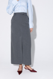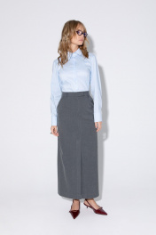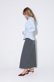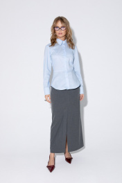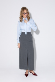 Комплект-двойка из приталенной хлопковой рубашки с галстуком и прямой макси-юбки с высоким разрезом. Детали: рубашечный воротник, застежка на петли и пуговицы, фигурная нагрудная вытачка-складка, втачные рукава, длинные рукава с притачными манжетами, фигурный низ, съемный галстук. Юбка на притачном поясе со шлевками, талиевые вытачки, боковые карманы, застежка на потайную молнию, на подкладке. Длина рубашки по спинке около 62 см в размерах 40-46 и около 64 см в размерах 48-52, длина рукава около 60 см. Длина юбки по боковому шву с поясом около 95 см в размерах 40-52 см