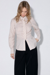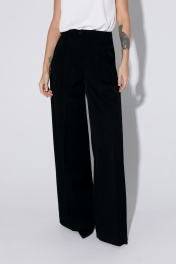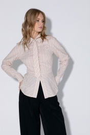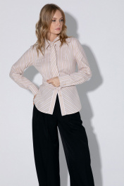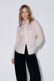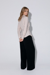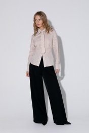 Комплект-двойка из приталенной хлопковой рубашки с галстуком и брюк-палаццо. Детали: рубашечный воротник, застежка на петли и пуговицы, фигурная нагрудная вытачка-складка, втачные рукава, длинные рукава с притачными манжетами, фигурный низ, съемный галстук. Широкие брюки-палаццо с небольшими складками у пояса и заутюженными стрелками, притачной пояс со шлевками, застежка на молнию и пуговицу, боковые карманы. Задние части брюк с вытачками и имитацией карманов. Длина рубашки по спинке около 62 см в размерах 40-46 и около 64 см в размерах 48-52, длина рукава около 60 см. Длина брюк по боковому шву с поясом около 109,5 см, длина по внутреннему шву около 83 см