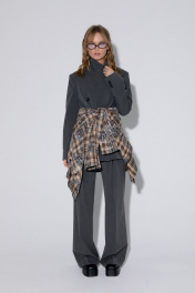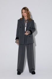 Костюм-двойка из свободного жакета и брюк-палаццо из текстильной ткани в рубчик. Детали: жакет свободного покроя и полуприлегающего силуэта, двубортная застежка на петли и пуговицы, отрезные бочки, пиджачный воротник, функциональные карманы, жакет на подкладке. Широкие брюки-палаццо с небольшими складками у пояса и заутюженными стрелками, притачной пояс со шлевками, застежка на молнию и пуговицу, боковые карманы. Задние части брюк с вытачками и имитацией карманов. Длина жакета по спинке около 69 см в размерах 40-46 и около 72 см в размерах 48-52, длина рукавов около 62 см. Длина брюк по боковому шву с поясом около 109,5 см, длина по внутреннему шву около 83 см