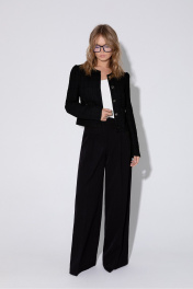 Костюм-двойка из укороченного жакета из фактурной ткани в стиле «шанель» и брюк-палаццо. Детали: жакет полуприлегающего силуэта, рельефы, круглая горловина, без воротника, рукава втачные со складками по окату, функциональные карманы, застежка на петли и пуговицы, на подкладке. Широкие брюки-палаццо с небольшими складками у пояса и заутюженными стрелками, притачной пояс со шлевками, застежка на молнию и пуговицу, боковые карманы. Задние части брюк с вытачками и имитацией карманов. Длина жакета по спинке около 48 см в размерах 40-46 и около 51 см в размерах 48-52, длина рукава около 65 см. Длина брюк по боковому шву с поясом около 109,5 см, длина по внутреннему шву около 83 см