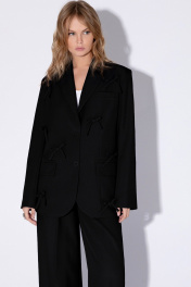 Костюм-двойка из оверсайз жакета с бантиками и брюк-палаццо. Детали: жакет прямого силуэта, расширенная линия плеч, пиджачный воротник, перед с прорезными функциональными карманами, однобортная застежка на петли и пуговицы, спинка со средним швом и шлицей, рукава втачные двухшовные, жакет на подкладке. Широкие брюки-палаццо с небольшими складками у пояса и заутюженными стрелками, притачной пояс со шлевками, застежка на молнию и пуговицу, боковые карманы. Задние части брюк с вытачками и имитацией карманов. Длина жакета по спинке около 69 см в размерах 40-46 и около 72 см в размерах 48-52, длина рукава около 62 см. Длина брюк по боковому шву с поясом около 109,5 см, длина по внутреннему шву около 83 см