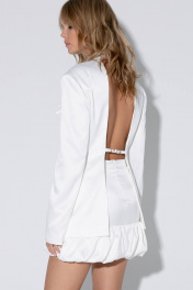 Костюм-двойка из приталенного жакета с открытой спинкой и мини-юбки. Детали: жакет прилегающего силуэта, нагрудные вытачки, рельефные швы, пиджачный воротник, спинка с фигурным вырезом, прилегание можно регулировать при помощи хлястика, застежка на две петли и пуговицы, функциональные карманы, жакет на подкладке 100% вискоза. Юбка с талиевыми вытачками, верхний срез юбки на обтачках, низ с широкой притачной оборкой, застежка сзади на потайную молнию, на подкладке. Длина жакета по спинке около 67 см в размерах 40-46 и около 69 см в размерах 48-52, длина рукава около 61 см. Длина юбки по боковому шву около 42 см в размерах 40-46 и около 46 см в размерах 48-52