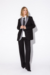 Асимметричный свободный жакет с двойным воротником. Детали: жакет свободного покроя и полуприлегающего силуэта, застежка на петли и пуговицы, функциональные карманы, на подкладке. Длина по спинке около 67 см в размерах 40-46 и около 69 см в размерах 48-52, длина рукава около 61 см
