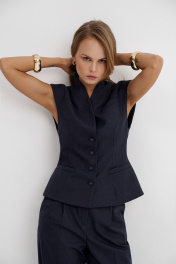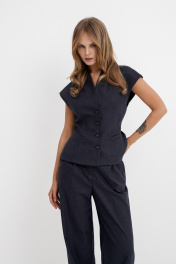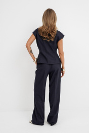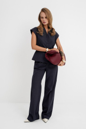 Костюм-двойка из приталенного жилета с воротником-стойкой и широких прямых брюк из текстильной ткани с рисунком «ёлочка». Детали: полуприлегающий силуэт, цельнокроеный воротник-стойка, рельефные швы переда и спинки, функциональные карманы, застежка на петли и пуговицы, жилет на подкладке. Брюки с притачным поясом со шлевками, передние половины с небольшими застроченными мягкими складками и заутюженными стрелками, застежка на молнию и пуговицу, боковые карманы. Задние части брюк с вытачками и заутюженными стрелками. Пояс брюк прямой, без резинки. Длина жилета по спинке около 54 см в размерах 40-46 и около 56 см в размерах 48-52. Длина брюк по боковому шву с поясом около 114 см в размерах 40-46 и около 115,5 см в размерах 48-52. Длина по внутреннему шву около 83 см