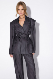 Текстильный костюм-двойка из свободного жакета с декором и прямых брюк со стрелками. Детали: жакет свободного покроя и полуприлегающего силуэта, двубортная застежка на петли и пуговицы, отрезные бочки, пиджачный воротник, функциональные карманы, жакет на подкладке, съемный пояс. Брюки с высокой посадкой, притачной пояс со шлевками, передние половины с небольшими застроченными мягкими складками и заутюженными стрелками, застежка на молнию и пуговицу, боковые карманы. Задние части брюк с вытачками и заутюженными стрелками. Пояс брюк прямой, без резинки. Длина жакета по спинке около 69 см в размерах 40-46 и около 72 см в размерах 48-52, длина рукавов около 62 см. Длина брюк по боковому шву с поясом около 114 в размерах 40-46 и около 115,5 см в размерах 48-52. Длина по внутреннему шву около 83 см