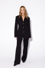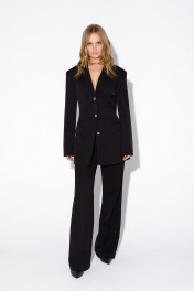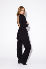 Костюм-двойка из приталенного жакета с открытой спинкой и широких прямых брюк со стрелками. Детали: жакет прилегающего силуэта, нагрудные вытачки, рельефные швы, пиджачный воротник, спинка с фигурным вырезом, прилегание можно регулировать при помощи хлястика, застежка на две петли и пуговицы, функциональные карманы, жакет на подкладке 100% хлопок. Длина жакета по спинке около 75 см в размерах 40-46 и около 77 см в размерах 48-52, длина рукава около 61 см. Длина брюк по боковому шву с поясом около 114 в размерах 40-46 и около 115,5 см в размерах 48-52. Длина по внутреннему шву около 83 см