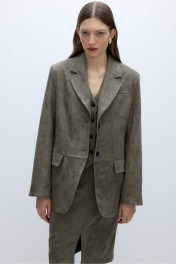 Костюм-двойка из свободного жакета и юбки-карандаш с высоким разрезом из экозамши. Детали: прямой силуэт, пиджачный воротник, функциональные карманы, застежка на петли и пуговицы, рукава втачные двухшовные, жакет на подкладке. Юбка на притачном поясе со шлевками, талиевые вытачки, боковые карманы, застежка на потайную молнию, на подкладке. Длина жакета по спинке около 70 см в размерах 40-46 и около 72 см в размерах 48-52, длина рукава около 62 см. Длина юбки по боковому шву с поясом около 61 см в размерах 40-52 см.