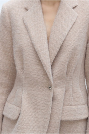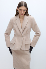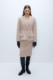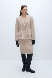 Костюм-двойка из укороченного приталенного жакета со складками и юбки-карандаш из пушистой ткани. Детали: пиджачный воротник, перед с функциональными карманами, застежка на одну петлю и пуговицу, рукава втачные двухшовные, спинка с рельефами и резинкой по талии. Жакет на подкладке. Юбка с высокой посадкой на притачном поясе, застежка на потайную молнию и пуговицу по спинке, шлица по низу юбки, на подкладке. Длина жакета по спинке около 64 см в размерах 40-46 и около 67 см в размерах 48-52, длина рукава около 61 см. Длина юбки по боковому шву с поясом около 63 см.
