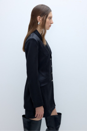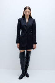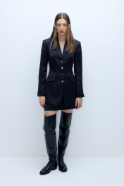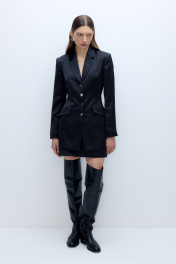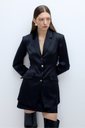 Атласный костюм-двойка из удлиненного приталенного жакета с декоративными пуговицами и мини-юбки. Детали: пиджачный воротник, перед с функциональными карманами, застежка на петли и декоративные пуговицы, рукава втачные двухшовные, спинка с рельефами и регулировкой-завязками по талии. Жакет на подкладке. Юбка трапециевидного силуэта, талиевые вытачки, потайная застежка, юбка на подкладке. Длина жакета по спинке около 75 см в размерах 40-46 и около 78 см в размерах 48-52, длина рукава около 61 см. Длина юбки по боковому шву около 43 см в размерах 40-46 и около 46 см в размерах 48-52.