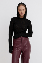 Комплект-двойка из базового лонгслива с капюшоном и прямых брюк из экокожи. Детали: лонгслив прямого силуэта, втачные удлиненные рукава. Перед и спинка удлиненные, что позволяет формировать драпировку по талии. Брюки с высокой посадкой, прилегающий силуэт, притачной пояс со шлевками, застежка на молнию и пуговицу, перед с боковыми карманами, спинка с кокеткой и двумя накладными карманами, разрезы по низу боковых швов. Изнанка экокожи с небольшим ворсом. Длина лонгслива спинке около 66 см, длина рукава около 70 см. Длина брюк по боковому шву с поясом около 110,5 см в размерах 40-46 и около 112 см в размерах 48-52 см.