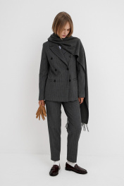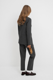 Текстильный костюм-двойка из двубортного жакета и укороченных брюк со средней посадкой. Детали: жакет прямого силуэта, пиджачный воротник, перед с прорезными карманами, застежка на петли и пуговицы, спинка со средним швом, рукава втачные двухшовные, жакет на подкладке. Брюки на притачном поясе со шлевками, передние половины с небольшими мягкими складками и заутюженными стрелками, застежка на молнию и пуговицу, боковые карманы. Длина жакета по спинке около 66 см в размерах 40-46 и около 69 см в размерах 48-52, длина рукава около 61 см. Длина брюк по боковому шву с поясом около 96,5 см в размерах 40-46 и около 98 см в размерах 48-52. Длина по внутреннему шву около 69 см.