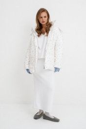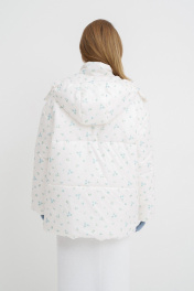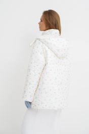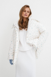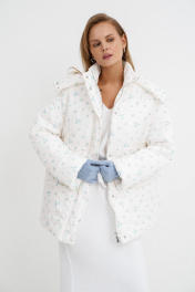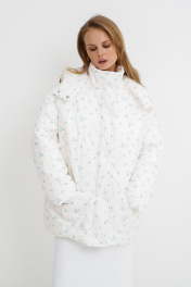 Стеганая оверсайз куртка с принтом. Детали: прямой силуэт, свободый покрой, спущенная линия плеча, капюшон, функциональные карманы, застежка на молнию и пробивные металлические кнопки, куртка на утепленной синтепоном подкладке. Наполнитель куртки ISOSOFT толщиной 200 г/м2. Длина по спинке около 71 см в размерах 40-46 и около 73 см в размерах 48-52, длина рукава+ плечо около 53+8 см