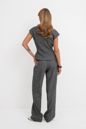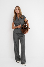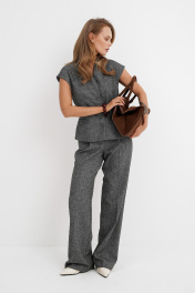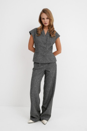 Костюм-двойка из приталенного жилета с воротником-стойкой и широких прямых брюк из меланжевой текстильной ткани. Детали: полуприлегающий силуэт, цельнокроеный воротник-стойка, рельефные швы переда и спинки, функциональные карманы, застежка на петли и пуговицы, жилет на подкладке. Брюки с притачным поясом со шлевками, передние половины с небольшими застроченными мягкими складками и заутюженными стрелками, застежка на молнию и пуговицу, боковые карманы. Задние части брюк с вытачками и заутюженными стрелками. Пояс брюк прямой, без резинки. Длина жилета по спинке около 54 см в размерах 40-46 и около 56 см в размерах 48-52. Длина брюк по боковому шву с поясом около 114 см в размерах 40-46 и около 115,5 см в размерах 48-52. Длина по внутреннему шву около 83 см