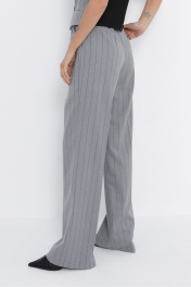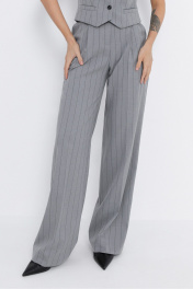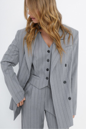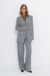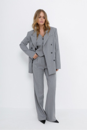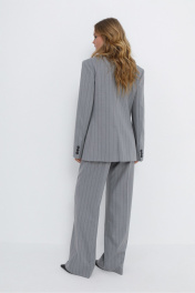 Костюм-двойка в полоску из свободного жакета и прямых широких брюк со стрелками. Детали: жакет свободного покроя и полуприлегающего силуэта, двубортная застежка на петли и пуговицы, отрезные бочки, пиджачный воротник, функциональные карманы, жакет на подкладке. Брюки с высокой посадкой, притачной пояс со шлевками, передние половины с небольшими застроченными мягкими складками и заутюженными стрелками, застежка на молнию и пуговицу, боковые карманы. Задние части брюк с вытачками и заутюженными стрелками. Пояс брюк прямой, без резинки. Длина жакета по спинке около 69 см в размерах 40-46 и около 72 см в размерах 48-52, длина рукавов около 62 см. Длина брюк по боковому шву с поясом около 114 в размерах 40-46 и около 115,5 см в размерах 48-52. Длина по внутреннему шву около 83 см