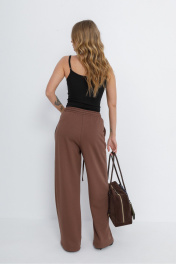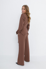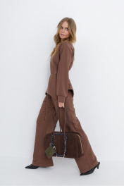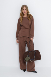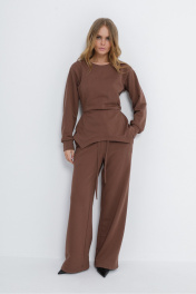 Трикотажный костюм-двойка из приталенного джемпера и свободных брюк. Детали: джемпер полуприлегающего силуэта, спущенная линия плеча, круглый вырез горловины, талия на резинке, застежка на потайную молнию в среднем шве спинки, рукава длинные с манжетами, фигурный низ. Брюки с высокой посадкой, эластичный пояс с резинкой, боковые карманы, без застежки. Костюм из трикотажа футер трехнитка. Длина по спинке около 56,5 см в размерах 40-46 и около 60,5 см в размерах 48-52, длина рукава+ плечо около 58,5+4 см. Длина брюк по боковому шву с поясом около 105 см, длина брюк по внутреннему шву около 78 см.
