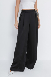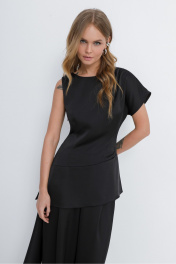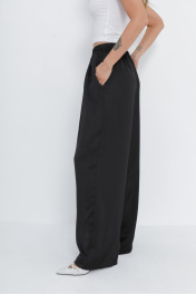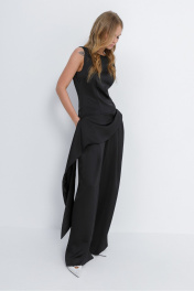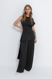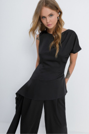 Атласный костюм-двойка из приталенной асимметричной блузы и широких брюк. Детали: туника приталенного силуэта, широкая горловина переда и спинки, талиевые вытачки, фигурный низ, потайная застежка-молния в среднем шве спинки. Брюки с высокой посадкой, передние половины брюк с двумя складками, эластичный пояс-резинка, боковые карманы, без застежки. Длина туники по спинке около 64,5 см. Длина брюк по боковому шву с поясом около 108 см, длина брюк по внутреннему шву около 79,5 см