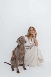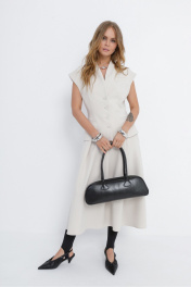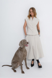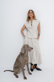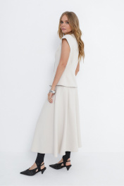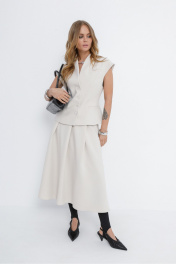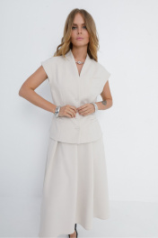 Текстильный костюм-двойка из приталенного жилета с воротником-стойкой и миди-юбки со складками. Детали: жилет полуприлегающего силуэта, цельнокроеный воротник-стойка, рельефные швы переда и спинки, функциональные карманы, застежка на петли и пуговицы, жилет на подкладке. Юбка на притачном поясе со шлевками, прорезные карманы, застежка на потайную молнию в левом боковом шве, юбка на подкладке. Длина жилета по спинке около 54 см в размерах 40-46 и около 56 см в размерах 48-52. Длина юбки по боковому шву с поясом около 80 см.