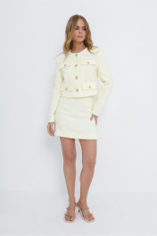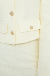 Костюм-двойка из укороченного жакета и мини-юбки из фактурной ткани. Детали: жакет прямого силуэта, расширенная линия плеч, талиевые вытачки, круглая горловина, без воротника, рукава втачные со шлицами, имитация карманов, застежка на петли и декоративные пуговицы, на подкладке. Длина жакета по спинке около 42 см в размерах 40-46 и около 45,5 см в размерах 48-52, длина рукава около 60,5 см.