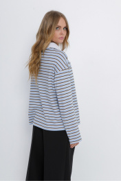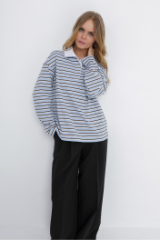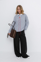 Комплект-двойка из свободного трикотажного поло в полоску и текстильных брюк-палаццо. Детали: поло прямого силуэта, свободный покрой, спущенная линия плеча, потайная застежка на петли и пуговицы, длинные рукава. Широкие брюки-палаццо с небольшими складками у пояса и заутюженными стрелками, притачной пояс со шлевками, застежка на молнию и пуговицу, боковые карманы. Задние части брюк с вытачками и имитацией карманов. Длина поло по спинке около 56 в размерах 40-46 и около 58 см в размерах 48-52, длина рукава+ плечо около 51+9 см. Длина брюк по боковому шву с поясом около 109,5 см, длина по внутреннему шву около 83 см.