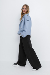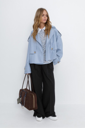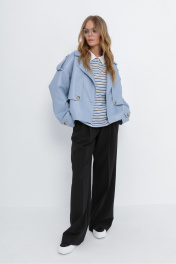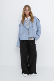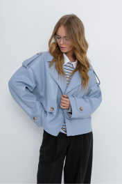 Свободный укороченный тренчкот из экокожи. Детали: спущенная линия плеча, отлетные кокетки переда, застежка на петли и пуговицы, спинка со средним швом, длинные рукава с широкими патами, на подкладке. Длина по спинке около 54,5 см в размерах 40-46 и около 57 см в размерах 48-52, длина рукава+ плечо около 52+10 см.