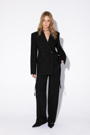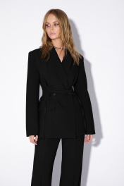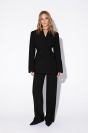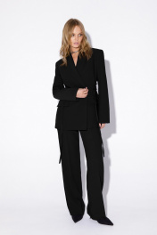 Костюм-двойка из жакета со шнуровкой и широких прямых брюк. Детали: жакет полуприлегающего силуэта, рельефы, пиджачный воротник, застежка на две петли и пуговицы, функциональные карманы, жакет на подкладке. Жакет также можно зашнуровать по бокам. Брюки с притачным поясом со шлевками, передние половины с небольшими застроченными мягкими складками и заутюженными стрелками, застежка на молнию и пуговицу, боковые карманы. Задние части брюк с вытачками и заутюженными стрелками. Пояс брюк прямой, без резинки. Длина жакета по спинке около 68,5 в размерах 40-46 и около 71,5 см в размерах 48-52, длина рукавов около 63 см. Длина брюк по боковому шву с поясом около 114 см в размерах 40-46 и около 115,5 см в размерах 48-52. Длина по внутреннему шву около 83 см