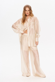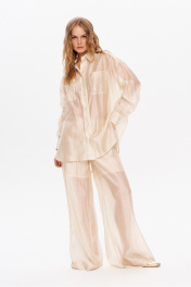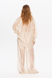 Полупрозрачный костюм-двойка из свободной рубашки и широких брюк на резинке. Детали: рубашка прямого силуэта, спущенная линия плеча, застежка на петли и пуговицы, длинные рукава с притачными манжетами, фигурный низ. Брюки с высокой посадкой на притачном эластичном поясе, без застежки, боковые карманы Брюки на подкладке из основной ткани. Длина рубашки по спинке около 78 см, длина рукава+ плечо около 55+7= 62 см. Длина брюк по боковому шву с поясом около 106 см в размерах 40-46 и около 107,5 см в размерах 48-52, длина по внутреннему шву около 78,5 см