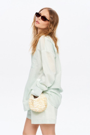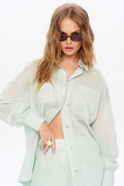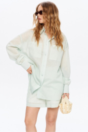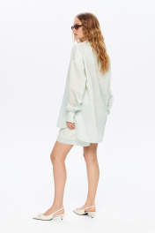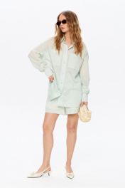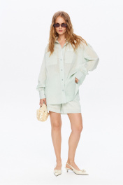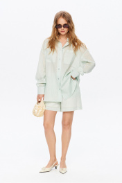 Костюм-двойка из свободной рубашки и шорт из полупрозрачной вискозы в тонкую полоску. Детали: рубашка прямого силуэта, спущенная линия плеча, застежка на петли и пуговицы, длинные рукава с притачными манжетами, фигурный низ. Шорты с эластичным поясом, без застежки, боковые карманы, подкладка- 100% вискоза. Длина рубашки по спинке около 78 см, длина рукава+ плечо около 55+7= 62 см. Длина шорт по боковому шву с поясом около 43 см в размерах 40-46 и около 46 см в размерах 48-52, длина по внутреннему шву около 15 см в размерах 40-46 и около 17,5 см в размерах 48-52