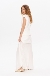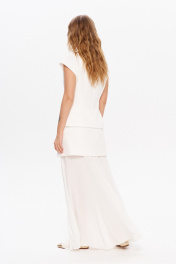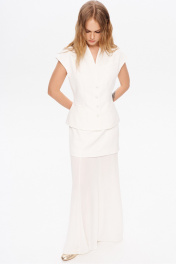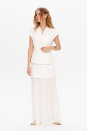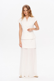 Костюм-двойка из приталенного жилета с воротником-стойкой и макси-юбки. Детали: полуприлегающий силуэт, цельнокроеный воротник-стойка, рельефные швы переда и спинки, функциональные карманы, застежка на петли и пуговицы, жилет на подкладке. Юбка с талиевыми вытачками, застежка на потайную молнию в левом боковом шве, верхняя мини-юбка на подкладке. Длина жилета по спинке около 54 см в размерах 40-46 и около 56 см в размерах 48-52. Длина мини-юбки по боковому шву около 35,5 см в размерах 40-46 и около 37,5 см в размерах 48-52. Длина макси-юбки по боковому шву около 101 см