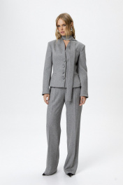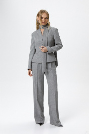 Широкие прямые брюки с рисунком «ёлочка». Детали: брюки с притачным поясом со шлевками, передние половины с небольшими застроченными мягкими складками и заутюженными стрелками, застежка на молнию и пуговицу, боковые карманы. Задние части брюк с вытачками и заутюженными стрелками. Пояс брюк прямой, без резинки. Длина брюк по боковому шву с поясом около 114 см в размерах 40-46 и около 115,5 см в размерах 48-52. Длина по внутреннему шву около 83 см