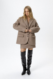 Оверсайз жакет из фактурной пальтовой ткани. Детали: жакет прямого силуэта, расширенная линия плеч, пиджачный воротник, перед с прорезными функциональными карманами, однобортная застежка на петли и пуговицы, спинка со средним швом и шлицей, рукава втачные двухшовные, жакет на подкладке. Длина по спинке около 72 см в размерах 40-46 и около 75 см в размерах 48-52, длина рукавов около 62 см.