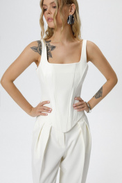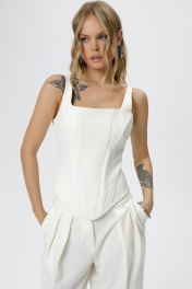 Корсет с глубоким квадратным вырезом из костюмной ткани в рубчик. Детали: прилегающий силуэт, фигурный вырез переда и спинки, рельефные швы с регилиновыми вставками, фигурный низ, застежка-шнуровка по спинке, регулируемые бретели. Длина корсета по боковому шву около 30 см в размерах 40-46 и около 31 см в размерах 48-52.
