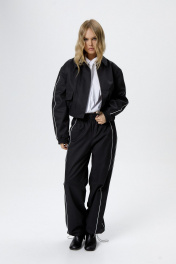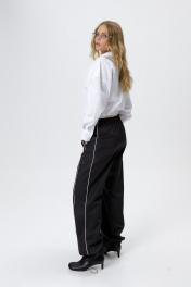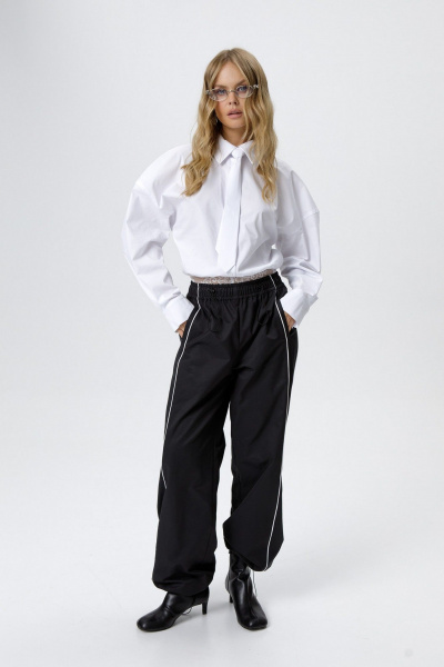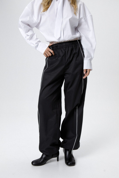 Свободные брюки с кантами. Детали: высокая посадка, функциональные карманы, пояс и низ брюк с резинкой и регулируемыми фиксаторами. Длина брюк по боку около 103 см, длина по внутреннему шву около 74 см.