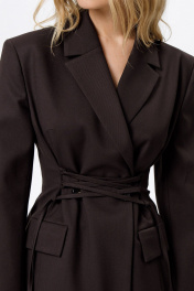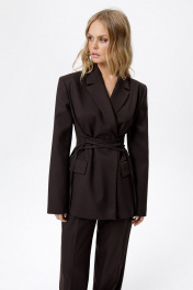 Костюм-двойка из жакета со шнуровкой и широких прямых брюк. Детали: жакет полуприлегающего силуэта, рельефы, пиджачный воротник, застежка на две петли и пуговицы, функциональные карманы, жакет на подкладке. Жакет также можно зашнуровать по бокам. Брюки с притачным поясом со шлевками, передние половины с небольшими застроченными мягкими складками и заутюженными стрелками, застежка на молнию и пуговицу, боковые карманы. Задние части брюк с вытачками и заутюженными стрелками. Пояс брюк прямой, без резинки. Длина жакета по спинке около 68,5 в размерах 40-46 и около 71,5 см в размерах 48-52, длина рукавов около 63 см. Длина брюк по боковому шву с поясом около 114 см в размерах 40-46 и около 115,5 см в размерах 48-52. Длина по внутреннему шву около 83 см