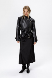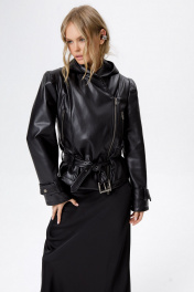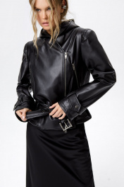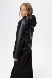 Куртка из экокожи с капюшоном и акцентными плечами.