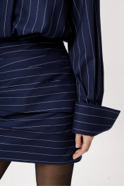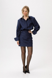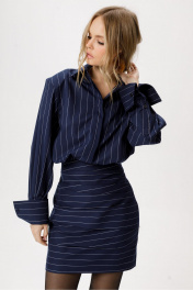 Платье-рубашка длины мини. Детали: платье полуприлегающего силуэта, отрезное по талии с напуском, нижняя часть переда с ассиметричными складками, нижняя часть спинки с талиевыми вытачками, верхняя часть платья со складками на талии, рубашечный воротник, застёжка на потайную планку с пуговицами, потайная молния в боковом шве, рубашечный покрой рукава с расширенным плечом, широкие манжеты. Юбка платья на подкладке