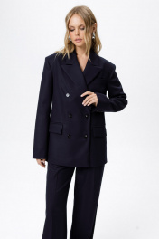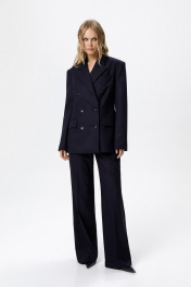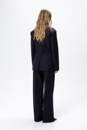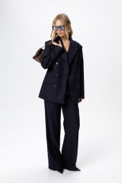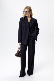 Текстильный костюм-двойка из свободного жакета и прямых широких брюк со стрелками. Детали: жакет свободного покроя и полуприлегающего силуэта, двубортная застежка на петли и пуговицы, отрезные бочки, пиджачный воротник, функциональные карманы, жакет на подкладке. Брюки с высокой посадкой, притачной пояс со шлевками, передние половины с небольшими застроченными мягкими складками и заутюженными стрелками, застежка на молнию и пуговицу, боковые карманы. Задние части брюк с вытачками и заутюженными стрелками. Пояс брюк прямой, без резинки. Длина жакета по спинке около 69 см в размерах 40-46 и около 72 см в размерах 48-52, длина рукавов около 62 см. Длина брюк по боковому шву с поясом около 114 в размерах 40-46 и около 115,5 см в размерах 48-52. Длина по внутреннему шву около 83 см
