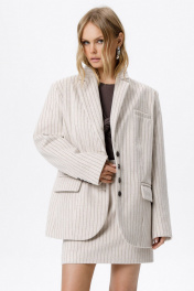 Оверсайз жакет в полоску. Детали: прямой силуэт, расширенная линия плеч, пиджачный воротник, перед с функциональными карманами, однобортная застежка на петли и пуговицы, спинка со средним швом и шлицей, рукава втачные двухшовные, жакет на подкладке. Длина по спинке около 69 см в размерах 40-46 и около 72 см в размерах 48-52, длина рукавов около 62 см