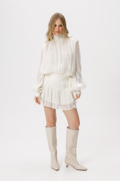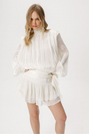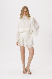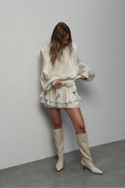Платье-мини со съёмными шортами из фактурной полупрозрачной ткани. Детали: полуприлегающий силуэт, воротник-стойка со сборкой и застёжкой на навесные петли и пуговицы, юбка платья с воланами, настрочной пояс в боковом шве юбки, рукава втачные удлиненные с манжетами, платье застёгивается на потайную молнию в среднем шве спинки. Длина платья по спинке в размерах 40-46 около 88 см, длина рукава около 67 см