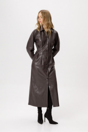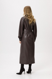 Платье из экокожи длины миди. Детали: полуприлегающий силуэт, застроченные складки по переду, спинка на резинке, рубашечный воротник, рукава покроя реглан, застёжка на петли и пуговицы, платье на подкладке. Длина платья по спинке около 125 см, длина рукава около 70 см