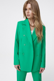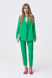 Текстильный костюм-двойка из двубортного блейзера «мужского» покроя и укороченных брюк со стрелками. Детали: прямой силуэт, пиджачный воротник, прорезные карманы, спинка со средним швом, втачные двухшовные рукава; брюки со средней посадкой, застежка на молнию и пуговицу, боковые карманы, передние половины с заутюженными стрелками и двумя небольшими складками Жакет: дл. спинки около 65/69см; дл. рукава около 60см Брюки: дл по боковому шву около 93,5/95см