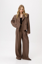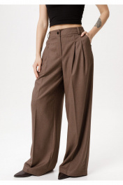 Широкие брюки-палаццо в полоску. Детали: брюки с притачным поясом со шлевками, складки у пояса, застежка на молнию и пуговицу, боковые карманы, заутюженные стрелки. Задние части брюк с вытачками и имитацией карманов. Длина по боковому шву с поясом около 109,5 см, длина по внутреннему шву около 83 см