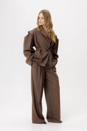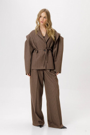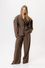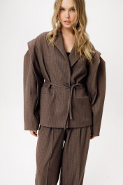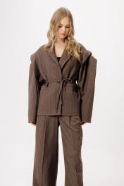 Оверсайз жакет со съёмным поясом. Детали: прямой силуэт, удлинённая линия плеча, втачной одношовный рукав с ассиметричными складками, функциональные карманы, центральная застёжка на 1 пуговицу, жакет на подкладке. Длина по спинке в размерах 40-46 около 67 см, в размерах 48-52 около 70 см, длина рукава около 61 см