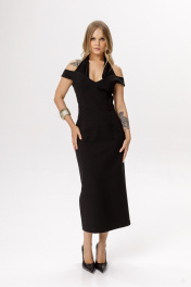 Платье миди с воротником «халтер». Детали: Прилегающий силуэт, платье отрезное по линии талии, рельефные швы по лифу переда, талиевые вытачки по лифу и юбке спинки, спущенные бретели, фигурный глубокий вырез горловины, потайная застёжка в среднем шве спинке, лиф платья на подкладке. Длина по спинке около 98 см