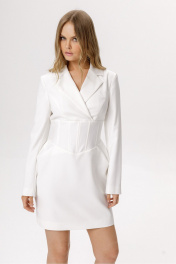 Корсетное текстильное платье длины мини. Детали: прилегающий силуэт, платье отрезное по линии талии, рельефы по переду лифа, талиевые вытачки на спинке лифа, складки по переду и боковым швам юбки, корсетный пояс с рельефными швами и регилином, втачной двухшовный рукав, пиджачный воротник, потайная застёжка на молнию в среднем шве спинки, шнуровка по спинке. Платье на подкладке. Длина по спинке в размерах 40-46 около 85 см, в размерах 48-52 около 89 см, длина рукава около 62 см