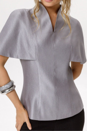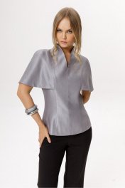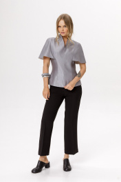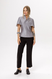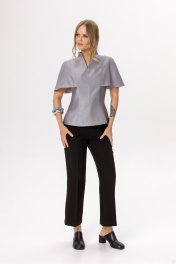 Комплект-двойка из блузы с цельнокроенной пелериной и укороченных брюк клёш. Детали: блуза прилегающего силуэта, талиевые вытачки по переду и спинке, цельнокроеная горловина стойка, потайная молния в среднем шве спинки, блуза на подкладке. Брюки клёш с притачным поясом со шлёвками, передние половины с заутюженными стрелками, застёжка на молнию и потайной крючок, наклонные карманы в боковых швах, задние половины брюк с вытачками и заутюженными стрелками. Пояс брюк без резинки. Длина блузы по спинке около 62 см в размерах 40-46, около 65 см в 48-52. Длина брюк по боковому шву с поясом около 96 см в размерах 40-46 и около 98 см в размерах 48-52. Длина по внутреннему шву около 67 см