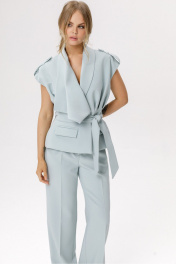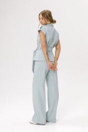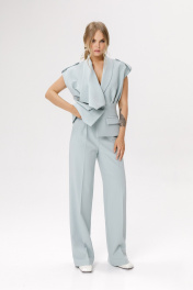 Текстильный костюм-двойка из приталенного жилета с асимметричным воротником и прямых широких брюк со стрелками. Детали: жилет приталенного силуэта, асимметричный воротник, отрезная линия талии со складками, спущенное плечо, функциональные карманы, застежка на петли и пуговицы, съемный пояс, жилет на подкладке. Брюки с высокой посадкой, притачной пояс со шлевками, передние половины с небольшими застроченными мягкими складками и заутюженными стрелками, застежка на молнию и пуговицу, боковые карманы. Задние части брюк с вытачками и заутюженными стрелками. Пояс брюк прямой, без резинки. Длина жилета по спинке около 57 см в размерах 40-46 и около 60 см в размерах 48-52. Длина брюк по боковому шву с поясом около 114 в размерах 40-46 и около 115,5 см в размерах 48-52. Длина по внутреннему шву около 83 см