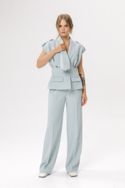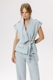 Приталенный жилет с асимметричным воротником. Детали: жилет приталенного силуэта, асимметричный воротник-шаль, отрезная линия талии со складками, спущенное плечо, функциональные карманы, застежка на петли и пуговицы, съемный пояс, жилет на подкладке. Длина по спинке около 57 см в размерах 40-46 и около 60 см в размерах 48-52