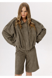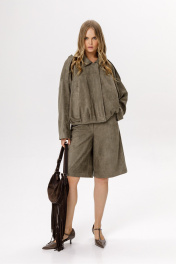 Шорты-бермуды из замши (приобрести бомбер с фото можно по арт. 6592). Детали: широкие бермуды, притачной пояс со шлёвками, застёжка на молнию и кнопку, перед с наклонными карманами, спинка с кокеткой и двумя накладными карманами. Длина по боковому шву с поясом около 60 см в размерах 40-52. Длина по внутреннему шву около 31 см в размерах 40-52.