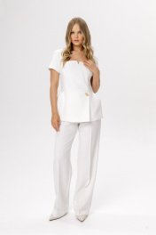 Костюм-двойка из приталенной асимметричной блузы с короткими рукавами и прямых широких брюк со стрелками. Детали: блуза полуприлегающего силуэта, отрезная линия талии, перед с фигурным вырезом горловины и складками по бокам, спинка со средним швом и застежкой на потайную молнию, рукава втачные короткие, блуза на подкладке. Брюки с притачным поясом со шлевками, складки, застежка на молнию и пуговицу, боковые карманы. Задние части брюк с вытачками и имитацией карманов. Длина блузы по спинке около 63,5 см в размерах 40-46, около 66 см в размерах 48-52, длина рукава около 17,5 см. Длина брюк по боковому шву с поясом около 109,5 см, длина по внутреннему шву около 83 см