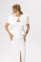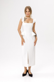 Приталенное миди-платье с глубоким вырезом и отлетными деталями по талии (приобрести кейп с фото можно по арт. 6640). Детали: прилегающий силуэт, кареобразный вырез горловины переда и спинки, отрезная линия талии, рельефные швы, потайная застежка по спинке, на подкладке. Длина по спинке от плеча около 123 см